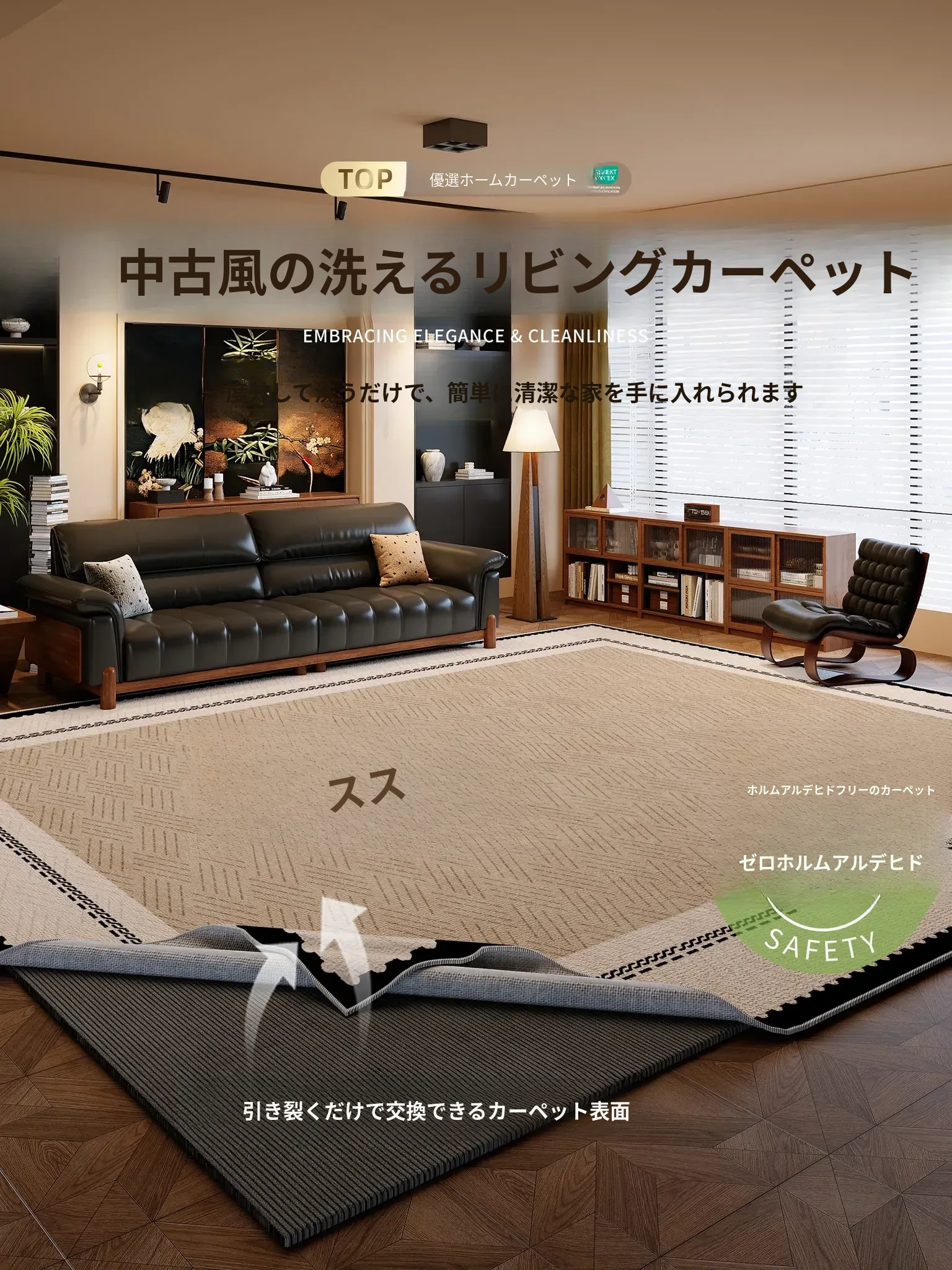 2025年新作!中古風スタイルのリビング用防水・防汚カーペット。お手入れ不要で、家庭にぴったりのカット可能な大面積カーペット。おしゃれで機能的、空間を華やかに演出します!