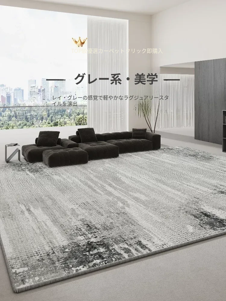 リビングルーム用カーペット2025新作!洗濯不要で拭き取り簡単、イタリアンミニマルデザインの高級グレー。防音効果あり、寝室のベッドサイドにもぴったりな防水・防汚仕様です。