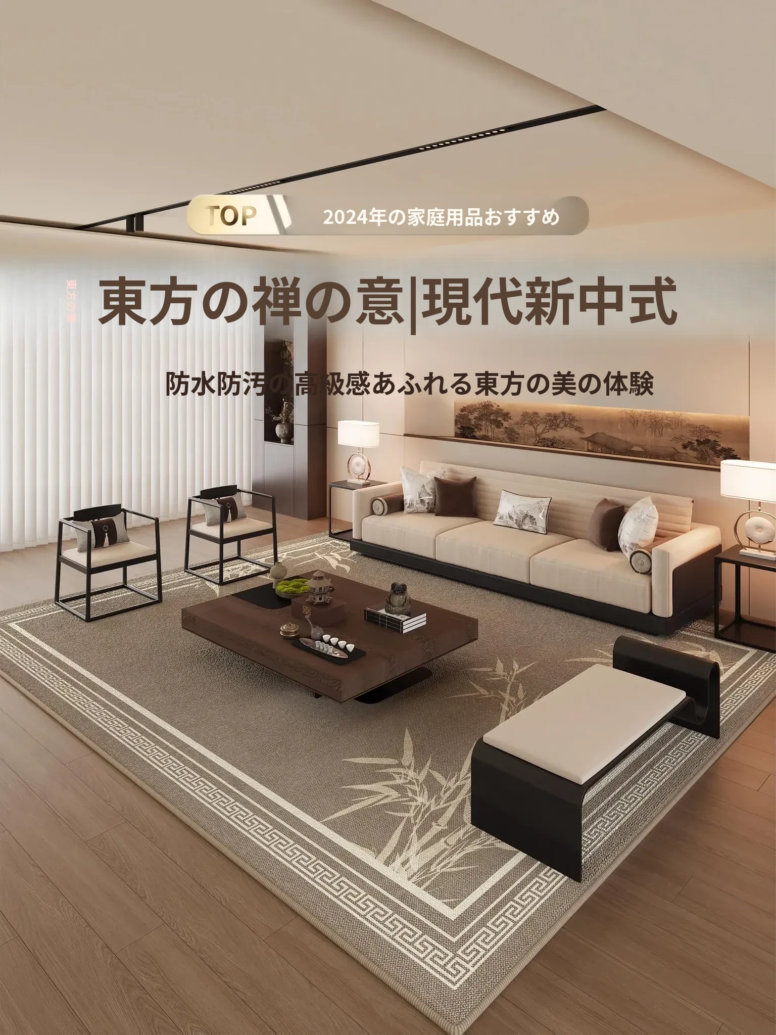 新中式デザインの高級ソファーとテーブルにぴったり!耐汚れ・お手入れ不要の広範囲カーペットで、リビングや寝室を上品に演出。シンプルでありながら贅沢な空間を実現します。